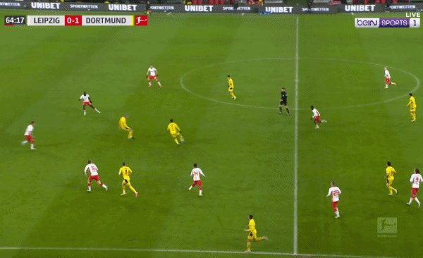 67'莱比锡RB前场连续传递,奥尔莫突入禁区小角度击中远门柱